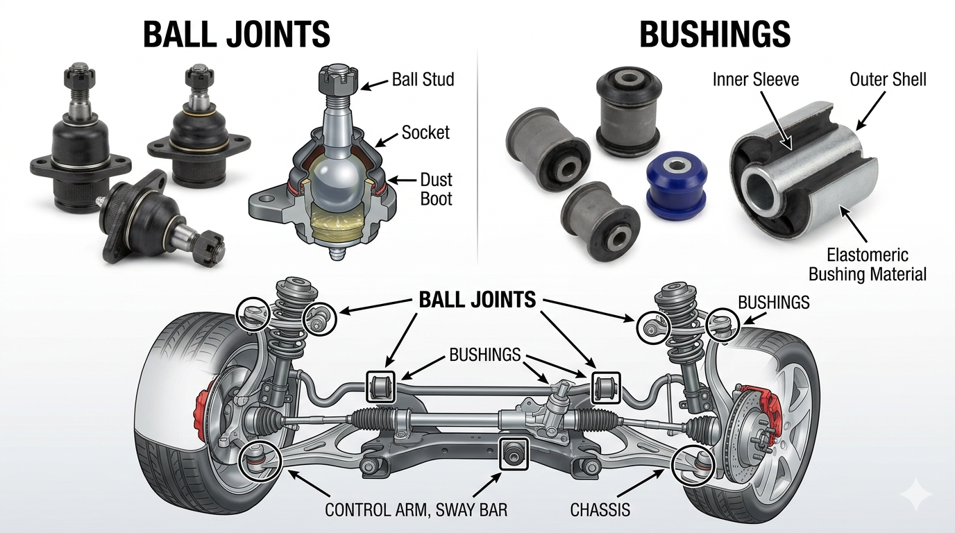 O primeiro sinal de alerta de falha nas juntas esféricas e buchas é o ruído anormal – especificamente sons de estalos, rangidos ou batidas da suspensão dianteira ao dirigir sobre lombadas ou durante curvas em baixa velocidade. Reconhecer precocemente a diferença entre falha da junta esférica e falha da bucha evita riscos à segurança e danos em cascata aos pneus, alinhamento e componentes de direção.